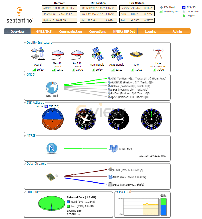 Septentrio reliable centimeter-level positioning is based on true multi-frequency, multi-constellation GNSS (GPS, GLONASS, Galileo, BeiDou, QZSS) technology. AsteRx-i3 S Pro+ combines GPS/GNSS and an industry-grade IMU (Inertial Measurement Unit) to deliver precise positioning together with 3D attitude (heading, roll, pitch). Septentrio’s unique GNSS – IMU integration algorithm enables continuous positioning in environments of low satellite visibility where short GNSS outages are possible. This is referred to as dead reckoning or coasting and can happen near high structures, under bridges or under thick foliage. This makes AsteRx-i3 S Pro+ a robust positioning solution for machinery operating in environments challenging for GNSS, such as in container yards, urban canyons or near cliffs